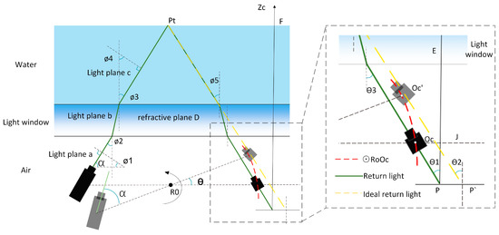 In the context of underwater measurements, the FWLS scanning imaging device is enclosed within a waterproof cover to ensure its functionality. Consequently, the device and the object being measured are situated in distinct media. When the instrument is operational, the laser is emitted towards the object being measured by passing through the light window and water. The light that is reflected back from the object likewise passes through the light window and water and is subsequently detected by the CCD. Hence, it becomes apparent that the light plane and the CCD image coordinate experience an excursion due to refraction [41,42,43]. To address this issue, mathematical models are established based on the measurement process, allowing for the determination of equations describing the dynamic light plane refraction and the offset of pixel coordinates on the plane. This mathematical model is illustrated in Figure 9.