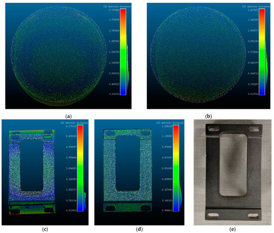 Point cloud error plotted before and after refraction error compensation. (a) The distance between the point cloud before refraction error compensation and the standard sphere point cloud. (b) The distance between the refraction error compensation point cloud and the standard spherical point cloud. (c) Distance between point clouds before correction of standard workpieces. (d) Distance between point cloud correction of standard workpieces. (e) Measured standard workpieces (approximate dimensions of workpiece: 101 mm × 60 mm × 7 mm).