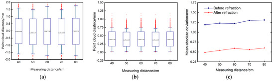 Five sets of point clouds were chosen, both before and after compensation. These point clouds were registered with the standard sphere point cloud, and the distances between the five groups of point clouds and the standard sphere point cloud were obtained. The box plots regarding distance distribution are presented in Figure 11a–c. The box plot diagrams reveal that the disparity between the measured point cloud and the standard sphere is primarily concentrated within the range of (−1, +1) prior to compensation. However, after compensation, the disparity is predominantly distributed within the range of (0.25, 0.75). The mean absolute error of the distance between the acquired point clouds is computed, as depicted in Figure 11c. The mean absolute deviation (MAD) prior to compensation measures approximately 1.25 mm. However, after applying the refraction compensation method, the MAD is effectively lowered to around 0.5 mm. This observation substantiates the authenticity and efficacy of the compensation algorithm. The analysis of dynamic refraction compensation serves as a foundation for future research on approaches for compensating dynamic refraction.