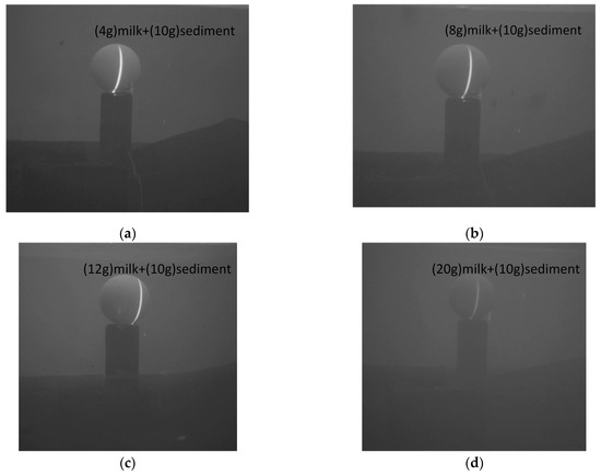 Diverse turbidity of underwater environments. (a) Image showing water’s turbidity after adding 4 g of milk and 10 g of sediment. (b) Image showing water’s turbidity after adding 8 g of milk and 10 g of sediment. (c) Image showing water’s turbidity after adding 4 g of milk and 12 g of sediment. (d) Image showing water’s turbidity after adding 4 g of milk and 20 g of sediment.