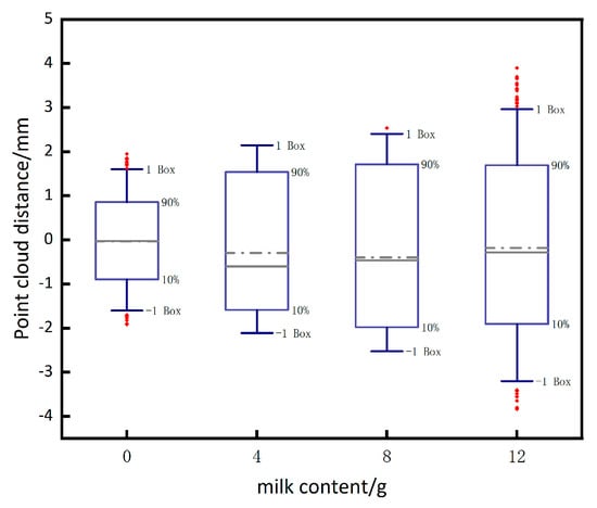 As shown in Figure 12, different amounts of milk and sediment were added to the experimental pool to create underwater environments with varying turbidity, and measurements were taken on the standard sphere in each of these four environments to obtain the error corresponding to the (a), (b), (c) plots as shown in Figure 13. When 20 g of milk is added to the underwater, the underwater turbidity is too high, resulting in the inability to image the underwater. To summarize, excessive turbidity in underwater conditions has two main effects on imaging. Firstly, it causes the scattering of light in both forward and backward directions, which hampers the quality of the images. Secondly, suspended particles in the water, like silt, partially absorb the returning light, leading to an inability to capture clear images.