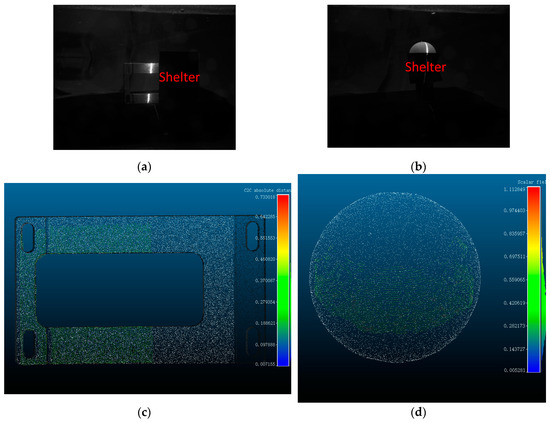 Simulation and error analysis of a measured target partially covered by an underwater barrier. (a) Underwater partially obscured standard workpieces. (b) Underwater partially obscured standard ball. (c) Underwater partly shaded standard workpiece error analysis. (d) Underwater partly shaded standard ball error analysis.