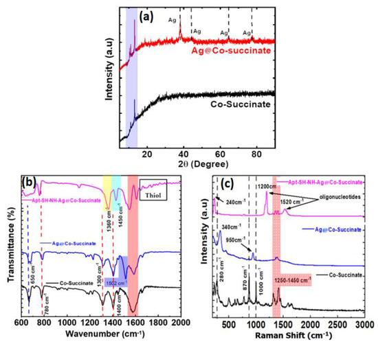 (a) X-ray diffraction patterns of Co-Succinate and Ag@Co-Succinate; (b) FTIR spectra of Co-Succinate, Ag@Co-Succinate, Apt-SH, and Apt-NH-Ag@Co-Succinate; (c) Raman spectra of Co-Succinate, Ag@Co-Succinate, Apt-SH, and Apt-NH-Ag@Co-Succinate.