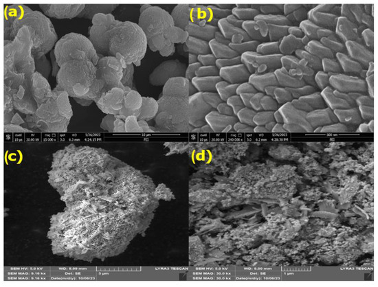 FE-SEM image of (a) Co-Succinate, (b) magnified image of Co-Succinate, (c) Ag@Co-Succinate, and (d) magnified image of Ag@Co-Succinate.