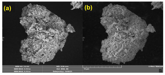 In Figure 2a, a field emission scanning electron microscopy (FE-SEM) image of Co-Succinate displays a unique and intriguing structural feature. The Co-Succinate sample has a cauliflower-like shape, with numerous interconnected spherical structures resembling florets. These structures have a complex and highly textured surface, as seen in Figure 2b. The distinctive morphology of Co-Succinate is critical because it affects the properties of the material and its potential applications. The FE-SEM image of Ag@Co-Succinate (Figure 2c,d) reveals the presence of agglomerated silver nanoparticles on the surface of Co-Succinate crystals. This observation is crucial because it indicates the successful formation of a composite and suggests the potential for unique material properties resulting from this combination. The FE-SEM images illustrate the structural attributes of Co-Succinate and Ag@Co-Succinate and provide visual evidence of the surface modifications and interplay between the materials. These observations are pivotal in shedding light on the morphological and structural changes that may influence the materials’ performance in HMI detection.