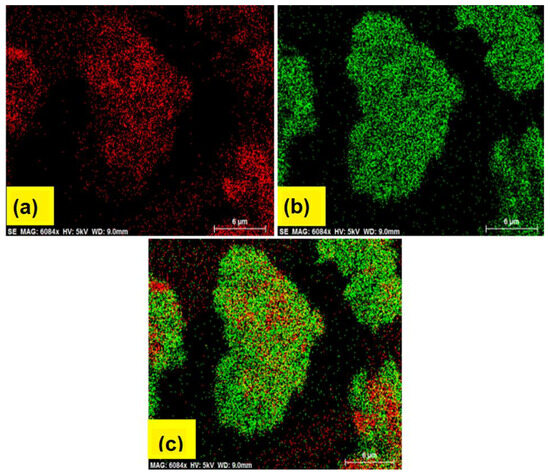 FE-SEM mapping images of Ag@Co-Succinate—(a) element Co, (b) element Ag, and (c) both Co and Ag elements.
