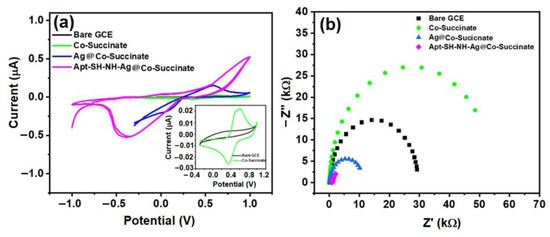 (a) Cyclic voltammogram. (b) Electrochemical impedance spectra of bare GCE, Co-Succinate, Ag@Co-Succinate, and Apt-SH-NH-Ag@Co-Succinate. The potential is vs. Ag/AgCl reference electrode.