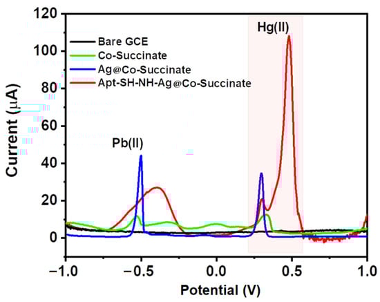 DPV responses for bare GCE, Co-Succinate, Ag@Co-Succinate, and Apt-SH-NH-Ag@Co-Succinate in PBS, pH 7.4, containing 10 nM of Hg(II), Pb(II), Cu(II), Fe(II), Zn(II), Ni(II), Cd(II), and Cr(II). The potential is vs. Ag/AgCl reference electrode.