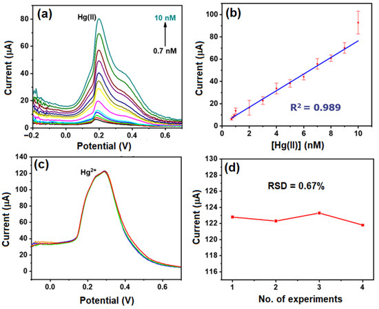 Figure 7a shows the DPV response of Apt-SH-NH-Ag@Co-Succinate towards Hg(II) ranging from 0.7 nM to 10 nM. The presence of Hg(II) improves the charge transfer capabilities of Ag@Co-Succinate, as evidenced by a steady and dramatic increase in the current responses, as shown in Figure 7a when Hg(II) concentration is raised. Calibration plots (Figure 7b) show the linearity of the obtained analytical current responses. The minimum deviation in the error bar for each of the concentration levels of Hg(II) offers the accuracy and stability of the developed Apt-SH-NH-Ag@Co-Succinate sensor. Sensitivity was found to be 7.45 µA/nM with R2 = 0.989. The limit of detection (LOD) has been calculated according to the formula 3σ/s, where σ is the standard deviation of current responses obtained at lower HMIs concentration, and s is the slope of the calibration curve. The determined LOD = 0.3 nM was far below the maximum concentration level (MCL) suggested by the US-EPA [2]. Four independent experimental trials yielded consistent findings at 10 nM Hg(II) concentrations. Figure 7c shows the repeatable differential current overlapping signals. This confirmed the current output after a repeatable sort of experiment at a low molar concentration of Hg(II), as shown in Figure 7d.