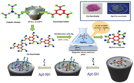 Graphical representation of synthesis of Co-Succinate, Ag incorporation into Co-Succinate, and LbL immobilization of Apt-SH and Apt-NH of Ag@Co-Succinate.