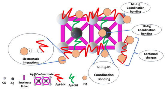Herein, both the aptamers (Apt-SH and Apt-NH) were developed to detect Pb(II) instead of Hg(II). The ligand exchange reaction occurs between the thiol functional group and amino functional groups. Due to this, the bonds between the metallic entities present in the Ag@Co-Succinate surface and an electron-donating end group ligand molecule, such as thiol and amine, undergo dynamic binding and unbinding processes [35,36]. Moreover, the ligand molecules on the surface can be exchanged by other ligands, possibly providing new properties or functionality to the particles. This may lead to aggregation of the particles. Such aggregation leads to disturbing the specific binding capacity of the aptamers to bind targeted HMIs.