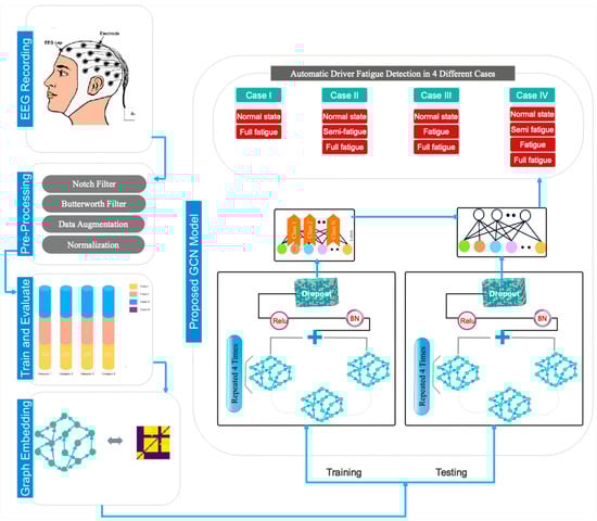 In order to solve the challenges of previous studies, the present study presents a new method for the automatic multi-level detection of driver fatigue using EEG signals. Accordingly, in the proposed method, a comprehensive benchmark database will be registered for the automatic detection of driver fatigue based on the minimum channel of EEG signals. After data augmentation using generative adversarial networks (GANs) from deep graph convolutional networks (GCNs) that have good resistance to environmental noises, including sounds related to the car engine, cabin, and passenger voices, in order to make a selection, end-to-end feature extraction and classification will be used. The confirmation of driver fatigue in this research will be performed based on the physiological changes of ECG, EMG, and respiratory effort and will not be limited to self-report questionnaires as in previous studies.