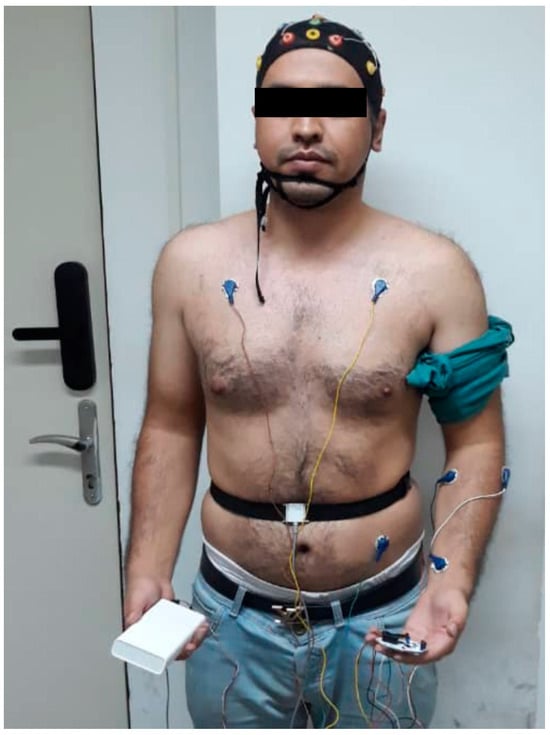 between the electrode and the skin. As mentioned in the review section of previous research, previous research evaluated the fatigue of drivers based on self-report questionnaires. The use of these questionnaires is unprincipled and can cause a disturbance in the correct diagnosis because of incorrect self-statements from the drivers. To solve this problem, in addition to using the questionnaire, we have also recorded other physiological signals, including ECG, EMG, and respiratory effort signals. These signals are recorded along with the EEG signals from the participants in the experiment. However, in the process of processing using the proposed architecture, only EEG signals have been used, and other physiological signals have been intuitively and qualitatively examined by a neurologist just to confirm fatigue. To achieve this goal, the OpenBCI module was used synchronously with the Encephalon device in order to record physiological signals. To record the ECG signal, three leads with sticky electrodes (two electrodes for recording and one electrode for reference) were used in the chest of the participants with a sampling frequency of 500 Hz. Also, EMG signals were recorded using three sticky electrodes (two electrodes for recording and one electrode for reference) with the same frequency on the wrists to control steering wheel movements. In addition, a sensor belt was used to monitor participants’ inhalation and exhalation to determine the drivers’ breathing efforts during the test. How to connect the cap, electrodes, and sensors to measure physiological signals is shown in