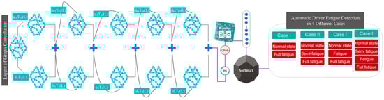 The architecture of the proposed model consists of a number of convolutional graph layers that perform feature selection/extraction and hierarchical (end-to-end) classification from the recorded data. Also, graph convolution layers extract dynamic information from the connected EEG channels. The architecture of the model presented in this research uses five convolution graph layers. Graph approximation in each convolution graph layer is performed using Chebyshev polynomial expansion. In each of the layers of the convolution graph, the Leaky Relu activation unit is used. Also, the output of each layer is connected to batch normalization to speed up the model-training process and make the network more stable. The feature vector extracted from the fifth layer passes through a dropout layer to avoid overfitting the model during the training process. A flattening layer is then used before labeling. Finally, the output of the previous step reaches the fully connected layer along with a softmax function to perform the labeling operation in order to automatically detect the driver’s fatigue in different cases. The operations described in this section are shown graphically in