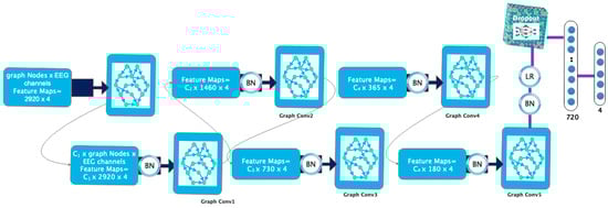 Figure 6, the reduction of dimensions in the layers is clear. These dimensions are determined based on the sampling frequency and the duration considered in each fatigue stage. In the proposed architecture, the number of EEG channels considered is equal to the number of nodes in the GCN model. Accordingly, in the first layer of convolution, each node in the constructed graph will have 2920 samples per vertex. The weight dimensions, along with the details of the layers, including the number of parameters, are shown in