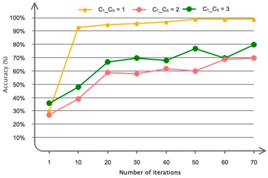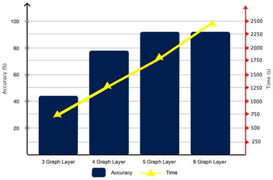 Figure 7. According to this figure, as can be seen, a number of five convolutional graph layers optimized accuracy and time. According to the figure, if considering six layers, accuracy does not change much. However, the duration of training increases. Accordingly, the number of layers in the proposed GCN model is five. Various coefficients were considered in the proposed architecture for Chebyshev polynomial expansion. The results obtained for the considered coefficients are shown in