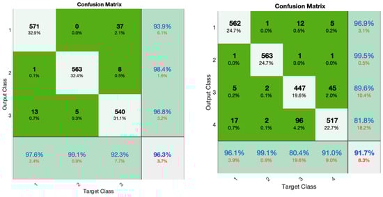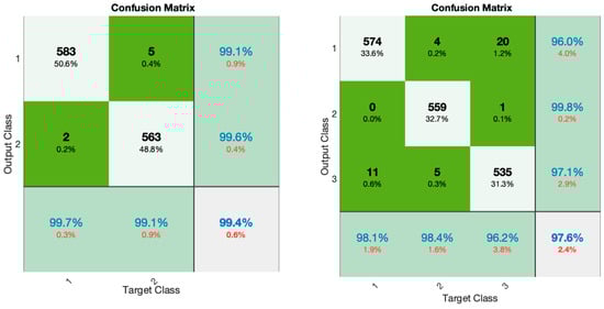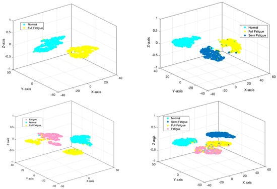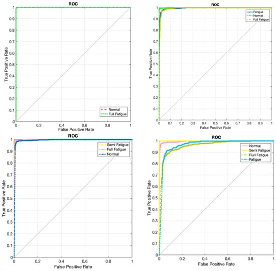 Figure 10 shows the confusion matrix for the four considered cases of two classes, three classes, and four classes. As can be seen, only two samples for case I are misdiagnosed as the fatigue state.