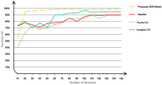 Figure 13. As can be seen, the proposed GCN model has higher convergence speed and more accuracy compared to AlexNet and Inception networks.