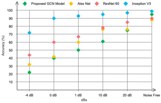 Figure 14. As can be seen, the classification accuracy of the proposed GCN model remains above 90% until SNR = 0 dB.