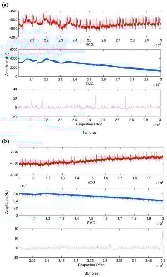 Figure 15a,b show the recorded signals for normal and full fatigue, respectively. Based on