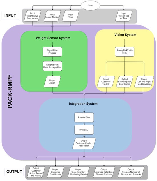 The integration system used a particle filter for trajectory tracking of the bounding box and the hand keypoints. These trajectories were processed via random sample consensus (RANSAC) to identify the correct customer who performed the weight event. With that, the data process of PACK-RMPF is summarized in Figure 2.
