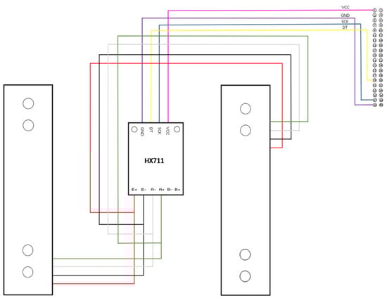 As illustrated in Figure 4, the wires of each load cell were connected in parallel when interfaced with the inputs of an HX711 amplifier module. By default, the module had a gain of 124 and a corresponding sampling rate of 80 Hz. Each module was connected to a Raspberry Pi 4B that would then process the readings from each weight bin concurrently. The ground, supply, and clock pins for each HX711 module were the same, while each digital output was connected to a dedicated GPIO pin.