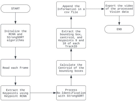 The Keypoint R-CNN used was the built-in PyTorch model (accessed on 7 November 2023 https://pytorch.org/vision/main/models/keypoint_rcnn.html) with ResNet-50 [20] and feature pyramid networks [21] as the backbone. Our Keypoint R-CNN used a pre-trained model from the COCO dataset [22]. Each person identified via the model was assigned to have 17 keypoints. Alongside with these keypoints, the corresponding bounding box was also detected via the model. Only those detections having a confidence score of 80% or higher were considered—this rule was put in place to filter out false positive detections. Each bounding box was assigned an ID through StrongSORT, which is an MOT baseline that utilizes a tracking-by-detection paradigm approach. This tracked and associated objects in a scene through the appearance and velocity of the objects. The most pertinent keypoints from Keypoint RCNN were keypoints 9 and 10 which tracked the left and right hands, respectively. After performing both vision processes, the bounding box information and ID, keypoints 9 and 10, and the timestamps for each frame were exported to a comma separated- values (CSV) file.