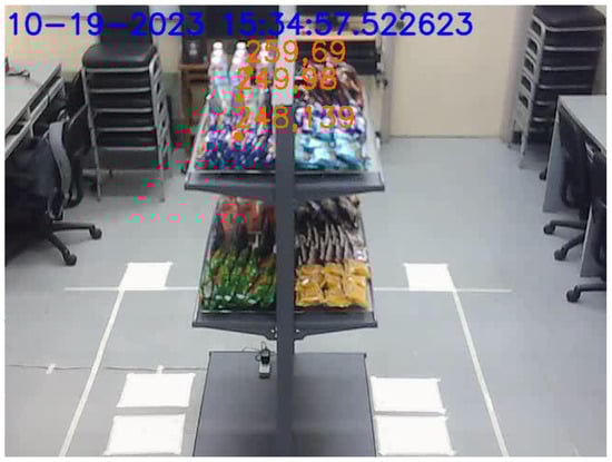 The shelf tested was a double-sided gondola shelf equipped with two rows, 0.5 m apart, on each side. Each row contained three (3) weighing platforms primarily operational through a pair of straight bar load cells, hereinafter referred to as weight bins, for a total of twelve (12) weight bins. Distinct products were placed on each weight bin, corresponding to twelve (12) products. The number of units per product varied based on the dimensions of each product. The camera was located 2.43 m away from the shelf and 2.26 m from the ground, as depicted in Figure 1.