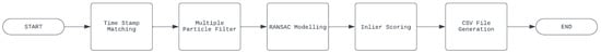 Then, the algorithm tries to find where the timestamps of and are equal—or if there are no equal timestamps—within the 500 ms latency. Then, from Equation (1), all vision attributes associated with a vision timestamp within the range of the are selected. The selected are stored alongside , and for processing in the multiple particle filter block.