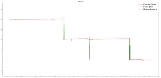Each weight data stream is continuously processed via its moving variance, . The weight change event detection, , is shown in Equation (3). It is considered to be detected once a weight data stream, , goes above a pre-defined product threshold, .