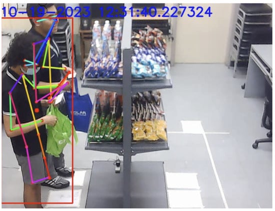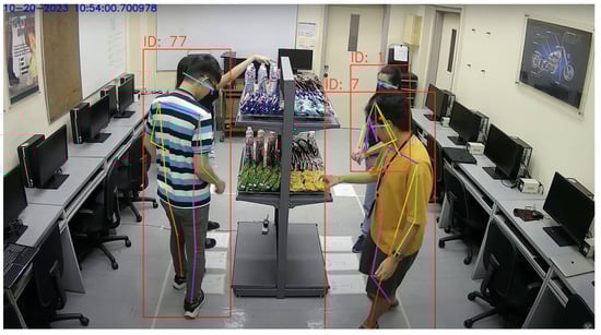 Furthermore, the vision system utilized a pre-trained StrongSORT model for assigning each customer a track ID and for Re-ID purposes. Its detector was trained on the CrowdHuman dataset [20,21] and the MOT17 half-training set [20]. The training data were generated by cutting annotated trajectories, not tracklets, with random spatiotemporal noise at a 1:3 ratio of positive and negative samples [20]. Adam was utilized as the optimizer, and cross-entropy loss was utilized as the objective function and was trained for 20 epochs with a cosine annealing learning rate schedule [20]. For the appearance branch, the model was pretrained on the DukeMTMC-reID dataset [20]. In the study, strongSORT Re-ID weights utilized osnet_x_25_msmt17. Additionally, strongSORT was equipped with human pose estimation using a pre-trained Keypoint RCNN, Resnet 50 fpn model. Its purpose was to detect the hands of the customers, which would later be utilized in the integration system to track the trajectories of a customer’s hand.