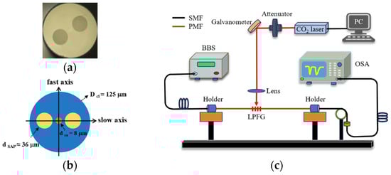 The Panda PM1300-XP was obtained from Thorlabs Inc., and the transverse section microscope photo and schematic diagram are presented in Figure 1a,b. There are three different regions as follows: a germanium-doped core, the two boron-doped stress regions, and silica cladding. It has a core diameter of 8.0 μm, a cladding diameter of 125.0 μm, a stress-applying parts (SAPs) diameter of 36.0 μm, and a Numerical Aperture (NA) of 0.12. The distance between the centers of two SAPs is about 28.5 μm. Figure 1c shows the schematic diagram of the experimental fabrication of LPFG. It consists of a 10.6 μm CO2 laser (48-1, SYNRAD) and two fiber holders. In addition, a horizontal microscope is used to observe the writing process in real-time. The transmission spectrum of the grating is monitored using a broadband light source (BBS, Golight, SLED LIGHT SOURCE) and an optical spectrum analyzer (OSA, AQ6370D, Yokogawa) with a resolution of 0.02 nm. In step 1, a PMF with a length of 20 cm was used to determine the fast or slow axis via a special PMF coupling system (PMF-425P-OHV). In step 2, the PMF was spliced between two single-mode fibers (SMFs), and a part of the PMF coating was stripped off along the axial direction. In step 3, the bare section of the PMF was exposed to the CO2-laser beam. Simultaneously, we rotated the fast or slow axis of the PMF to face upwards. In step 4, one side of the PMF was clamped using a fiber holder, while the other end was fixed and affixed with a weight of 20 g to ensure the straightness of the PMF during the writing process. In step 5, we adjusted the focal plane of the laser to align with the exposed fiber using the red-light indication of the co-optical axis. In step 6, the laser beam was controlled to scan PMF using a line-by-line technique at a controllable speed. Simultaneously, a microscope was used to observe the scanning process in real-time.