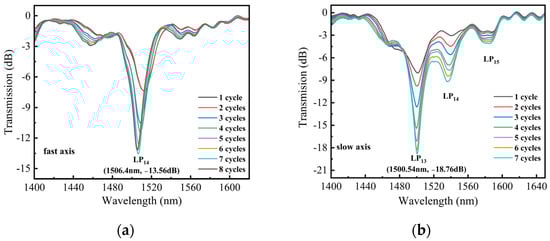 (a) The transmission spectrum of the LPFG irradiated along the fast axis; (b) The transmission spectrum of the LPFG irradiated along the slow axis.