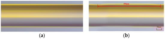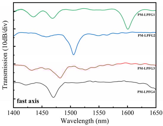 In our work, the average power of the CO2 laser and the frequency of the laser pulses were 2.78 W and 20 kHz, respectively. Figure 2a,b display the transmission spectra of two LPFGs that were irradiated along the fast and slow axis, respectively, under various scanning cycles. The grating pitch for both LPFGs is 595 μm, and the length is 29.75 mm, which corresponds to 50 grating periods. In Figure 2a, after 1 scanning cycle, the depth of the resonance dip is 7.4 dB. With the increase in the scanning cycle, the depth of the resonance dip gradually increases. When the scanning cycle reaches 7, the depth of the resonance dip is 13.5 dB. In Figure 2b, when the scanning cycle increases, the depth of the resonance dip also increases from 8 to 18.8 dB. Furthermore, there are no new dips observed in the spectral range of 1400–1650 nm as the scanning cycles increase. After 7 scanning cycles, the depth of the resonance dip reaches its maximum value. If the number of scanning cycles is increased further, the depth gradually decreases. This phenomenon suggests that the formant mode is over-coupled. The LPFG, which is written along the fast axis, exhibits a formant depth of 13.56 dB at 1506.4 nm, where its core fundamental mode is coupled to the LP14 cladding mode. For the LPFG written along the slow axis, the core fundamental mode is coupled to the LP13 cladding mode and the resonance peak, with a formant depth of 18.76 dB, located at 1500.54 nm. Figure 3a,b display the microscopic images of PMF before and after laser inscription. After laser inscription, the surface of PMF exhibits some small grooves. The mechanism of writing LPFG on PMF (PM-LPFG) using the CO2 laser is mainly to release residual stress in SAPs. When PMF is irradiated along the fast axis, the laser can directly impact both the core and SAPs [15]. Under the same power, the refractive index modulation is more significant for the LPFG written along the fast axis. In the case of the same period, the resonance peak wavelength of the LPFG written along the fast axis is longer than that of the LPFG written along the slow axis. Comparing the spectra of gratings written along the fast and slow axes, we observed that, when written along the fast axis, the spectrum exhibits smaller insertion loss and fewer side lobes. Such a spectrum can avoid the interference of other dips and is beneficial for wavelength demodulation in sensing measurements. We also fabricated three PM-LPFGs with periods of 585 μm, 590 μm, and 600 μm, respectively. The total lengths of these PM-LPFGs were 29.25 mm, 29.5 mm, and 30 mm. Similarly, all three PM-LPFGs were formed through seven scanning cycles. Figure 4 shows the transmission spectra of four PM-LPFGs fabricated along the fast axis, with the curves representing PM-LPFG1 (600 μm), PM-LPFG2 (595 μm), PM-LPFG3 (590 μm) and PM-LPFG4 (585 μm) from top to bottom. As seen in the figure, the resonance peaks gradually shifted towards longer wavelengths as the period increased, which is consistent with the behavior of regular single-mode LPFGs.