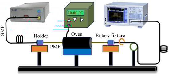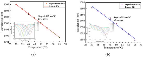 The schematic of the temperature experiment, based on the embedded structure, is shown in Figure 7. The temperature of the oven was set from 30 to 65 °C with intervals of 5 °C. The embedded structure underwent testing, and the shift in wavelength showed a good linear relationship with the change in temperature, as depicted in Figure 9a,b. In these figures, the error bars represent the wavelength deviation observed during the three temperature tests. Figure 9a illustrates that the temperature sensitivity of dip A is −0.303 nm/°C within the range of 30 to 65 °C. The inset shows the evolution spectrum of dip A with temperature variation, where the wavelength shifts towards shorter wavelengths as the temperature increases. This change can be attributed to the decrease in birefringence caused by the temperature increase [22], and, according to Equation (4), the wavelength of interference dips also decreases. In Figure 9b, it can be observed that the temperature sensitivity of dip B is −0.295 nm/°C within the same temperature range. The inset depicts the wavelength of dip B blueshifts with increasing temperature. This phenomenon can be explained by the presence of two SAPs in the PMF, where the thermal expansion coefficient of the cladding is larger than that of the core. As the temperature rises, the refractive index modulation of the cladding becomes larger than that of the core [23], resulting in a decrease in the resonance wavelength of the LPFG.