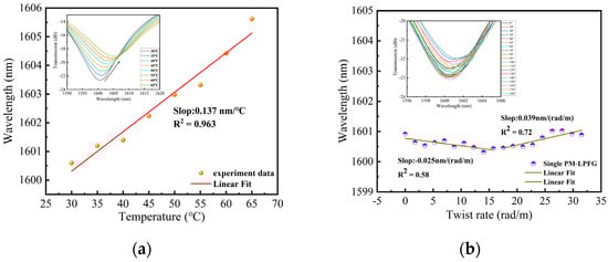 The temperature and twist characteristics of PM-LPFG1 were investigated using the experimental setup shown in Figure 5. One side of PM-LPFG1 is fixed on a fiber holder, while the other side is fixed on a rotating fixture (HFR007, Thorlabs). The distance between the two fiber holders, denoted as L, is 10 cm, and the degree of twist is denoted as θ. Therefore, the twist rate can be expressed as θ/L. The PM-LPFG1 was placed inside an oven with a temperature resolution of 0.01 °C. The temperature was controlled within the range of 30 to 65 °C, with increments of 5 °C. The sensor was kept at each temperature for 5 min, and the corresponding values from the OSA were recorded. Additionally, the twist response was examined by rotating the PM-LPFG1 from 0 to 31.5 rad/m, with increments of 1.75 rad/m. Figure 6a demonstrates that the temperature sensitivity is 0.137 nm/°C, and the inset displays the evolution spectrum of the resonance peak from 30 to 65 °C. As the temperature increases, the wavelength of the resonance dip undergoes a redshift. Figure 6b illustrates the relationship between the twist rate and wavelength, but the linearity between the twist and wavelength is not ideal. The low-temperature sensitivity of single PM-LPFG1 is attributed to the low thermal expansion coefficient of the PMF, which results in minimal length changes when the temperature varies. The reason for the low twist sensitivity is that most of the stress within the fiber is released, and the laser-induced changes in fiber size and shape are relatively small. When the twist is applied to a single PM-LPFG1, the effective refractive index difference and period variation are minimal.