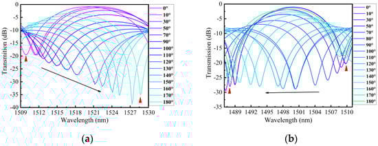 (a) Transmission spectrum evolution of dip A as the twist change from 0° to 180° (CW); (b) Transmission spectrum evolution of dip A as the twist change from 0° to 180° (CCW).