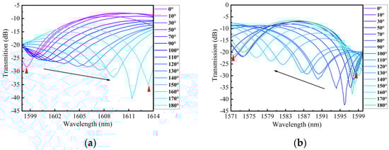 (a) Transmission spectrum evolution of dip B as the twist change from 0° to 180° (CW); (b) Transmission spectrum evolution of dip B as the twist change from 0° to 180° (CCW).