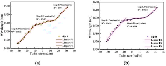 (a) The relationship between the twist rate and wavelength from −31.5 to 31.5 rad/m for dip A; (b) The relationship between the twist rate and wavelength from −31.5 to 31.5 rad/m for dip B.