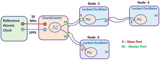 WR time synchronization technology is an advanced method used to distribute time (1 pulse per second) and frequency (10 MHz) signals from reference clocks to remote locations via optical fibre links [6,7]. This technology was launched at the European Organization for Nuclear Research (CERN) in 2009 and is now available as open source for research and further modifications [8]. The schematic representation of a WR network is shown in Figure 1. According to the figure, the first WR element in the network (WR switch/WR node) is configured in Grandmaster mode by providing reference signals (10 MHz and 1PPS) from the reference atomic clock. The grandmaster then sends synchronization messages to WR elements (Node 1 and Node 2) in its lower hierarchy, establishing the WR link using the master–slave mechanism. After that, following the White Rabbit precision time protocol (WRPTP), slaves (Node 1 and Node 2) are synchronised with the master (Grandmaster). Furthermore, the synchronised slave (Node 1) works as a master for the WR elements that are placed in its lower hierarchy. Here, Node 3 is in the lower hierarchy of Node 1. Therefore, Node 1 acts as the master for Node 3 and sends the synchronization message. Again, following WRPTP, Node 3 is synchronised with Node 1. The same process is repeated in the WR network until all WR elements (WR nodes) are synchronised with the reference clock.