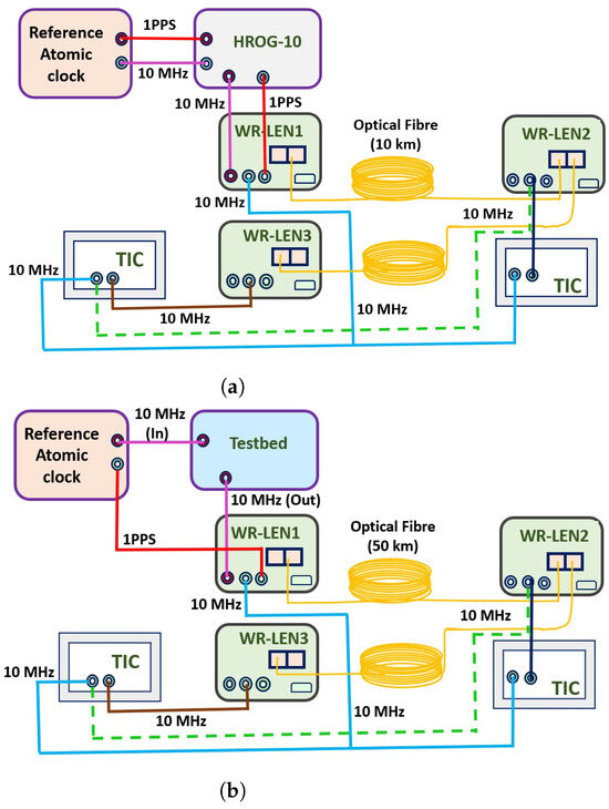 As shown in Figure 2a, i.e., experimental setup A, WRLEN1 is configured in GM mode by providing 10 MHz and 1 pulse per second (1PPS) reference signals from a Cs atomic clock through a phase compensator (HROG-10). WRLEN2 and WRLEN3 are in ‘Slave’ mode. WRLEN2, representing a remotely located clock, is connected to WRLEN1 through optical fibre. Similarly, WRLEN3 is connected to WRLEN2 with another optical fibre of the same length and is collocated with WRLEN1. The fibre spools are 10 km in length and the SFP transceivers operate at 1490/1310 nm. Time interval counters (TIC, Keysight 53230A) are used to measure the phase offset between different WRLENs.