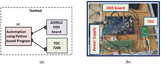 As mentioned previously, and shown in Figure 2b for experimental setup B, HROG-10 is replaced with a low-cost custom-designed testbed for phase-offset compensation. In this section, we describe the testbed setup details. The testbed comprises a time-to-digital converter evaluation module (TDC 7200 EVM) and a direct digital synthesizer (DDS AD9912 evaluation module). The important features of these modules have been summarised below.