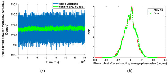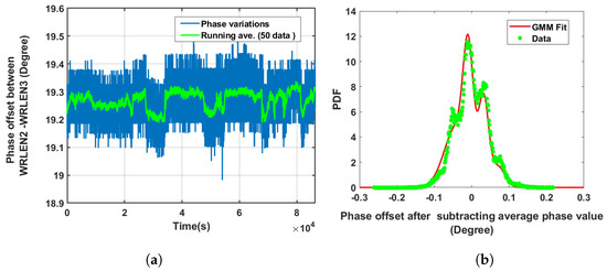 The phase variations recorded in these cases exhibit random variations; therefore, a statistical treatment for the analysis was adopted. The temporal variation of the phase is treated as a statistical random process, and we term the phase variations as the phase noise process in this paper. Different sets of data, namely, phase offsets between WRLEN1 and WRLEN2, WRLEN2 and WRLEN3, and WRLEN1 and WRLEN3, have been recorded in the internal memory of TIC in a “.csv file” format and then copied to an external device to analyse the random noise properties offline.