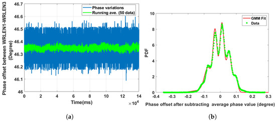Data set 2—phase offset between WRLEN2 and WRLEN3: In this data set, the phase difference between WRLEN2 and WRLEN3 was recorded at ms with a 10 km optical fibre. The peak-to-peak phase variation lies within degrees, as shown in Figure 6a. The phase difference between the WRLEN2 and WRLEN3 pdf consists of five mixing components. However, only three mixing components have significant contributions, with wi = 0.32, 0.48, and 0.13, as shown in Figure 6b.