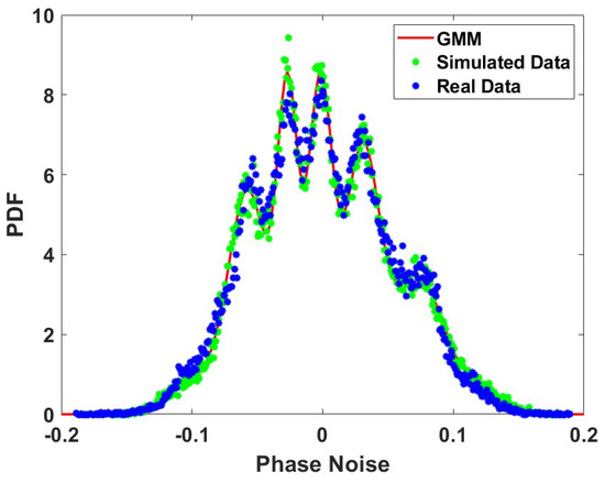 This method of generating random variables requires an explicit expression for the CDF and its inverse [25]. However, in the case where no closed-form expression exists for the CDF, a numerical-based solution can be adopted instead. In the model adopted in this paper, the GMM model, no mathematical expressions exist for and, therefore, we use the numerical method to computationally generate the random variables using the model parameters. The PDF of the simulated phase noise with the experimental phase noise is presented and compared in Figure 15; from the figure, we can observe that the model phase noise data closely match the experimental phase noise data.