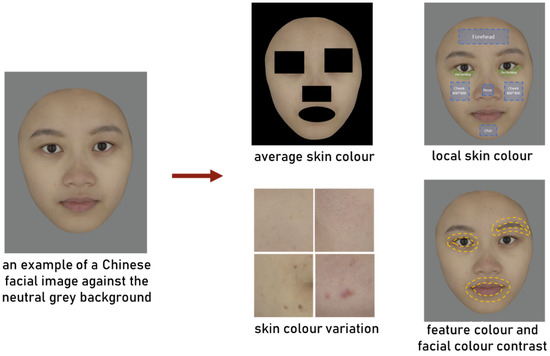 | Facial colour contrast | The adapted version of Michelson contrasts between three facial features (eyes, eyebrows, and mouth) and their surrounding skin [53]. | Eyes_C_L*, a*, b*, C*, hab | [17,54,55,56,57] |