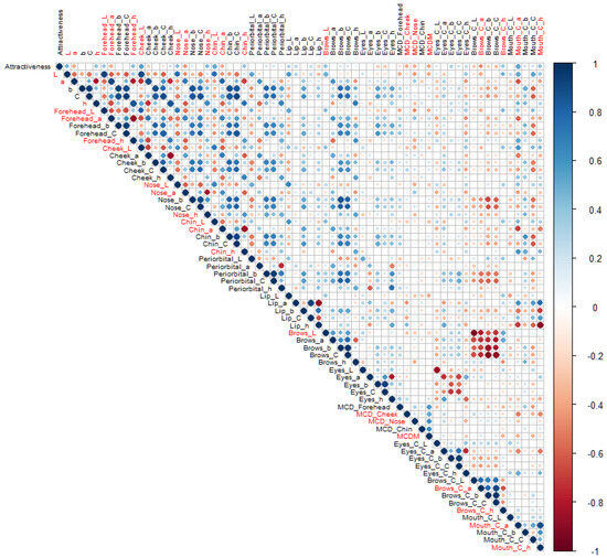 The correlation matrix between facial attractiveness ratings and facial colour characteristics. The twenty-one colour variables that have significant correlations (p < 0.05) with attractiveness ratings are marked in red.