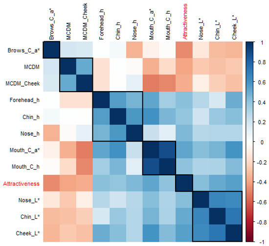 The correlation matrix between the top eleven colour predictors selected by LASSO and EN and facial attractiveness ratings are further visualised in the heatmap in Figure 5. To identify the hidden structure and pattern in the matrix, the 11 colour predictors were reordered based on the hierarchical clustering as shown in the five black boxes, which were brows colour contrast (a*), skin colour variation (overall or cheek), local skin hue angle (forehead, chin, or nose), the mouth colour contrast (a*), and local skin lightness L* (nose, chin, or cheek), from top left to bottom right.