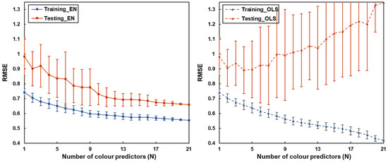 To further assess the impact of variable number on predictive accuracy, a comparative analysis of RMSE trends with an increasing number of colour predictors was performed (Figure 6). Based on the results above, the regression technique with the highest out-of-sample accuracy and relatively smaller number of selected predictors, the EN model, was used in comparison with the conventional OLS model. For each selected number of predictors (N), a corresponding set of N colour predictors was randomly selected from the set of relevant colour predictors to build the model. Figure 6 shows the mean and standard deviation of RMSEs across 30 random iterations.