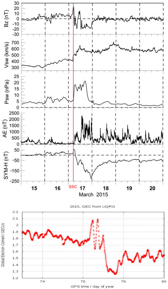 Figure 1. (Top plots): Space weather indices, B z , V s w , P s w , A E and S Y M H vs. time, in days of March 2015, around the St. Patrick 2015 geomagnetic storm (see Sudden Storm Commencement indicated by the vertical red line). (Bottom plot): GEC vs. time in days of year 2015, and with the same time scale than top plots (reproduced from [8]).